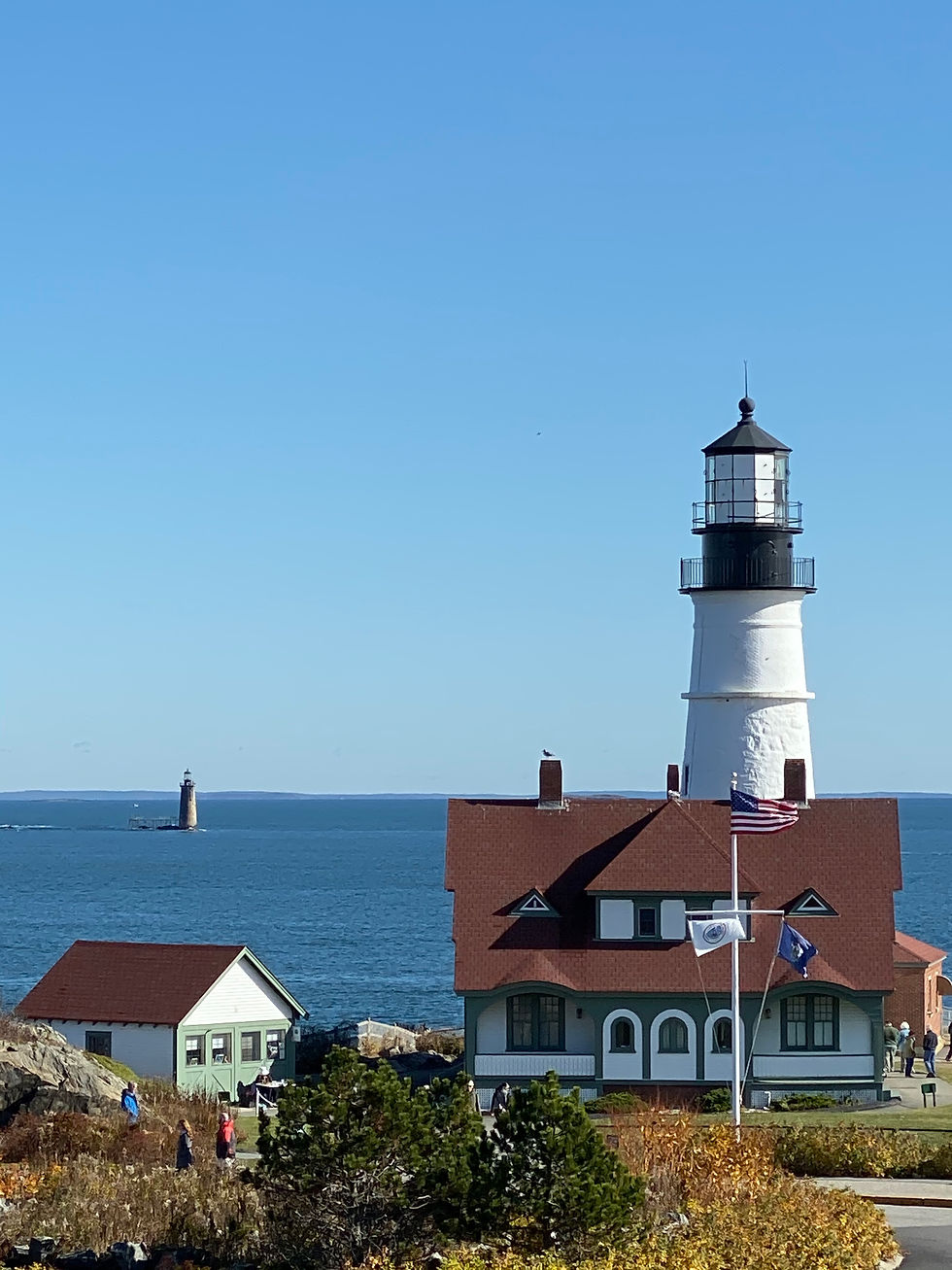 unexpectedly broadens to a scenic vista of waves pounding the rocky coastline just on the other side of the lighthouse. The Portland Harbor is typically dotted with small boats and large cruise ships amid the numerous tiny islands of rock that jut above the water, and that's exactly how it was today.